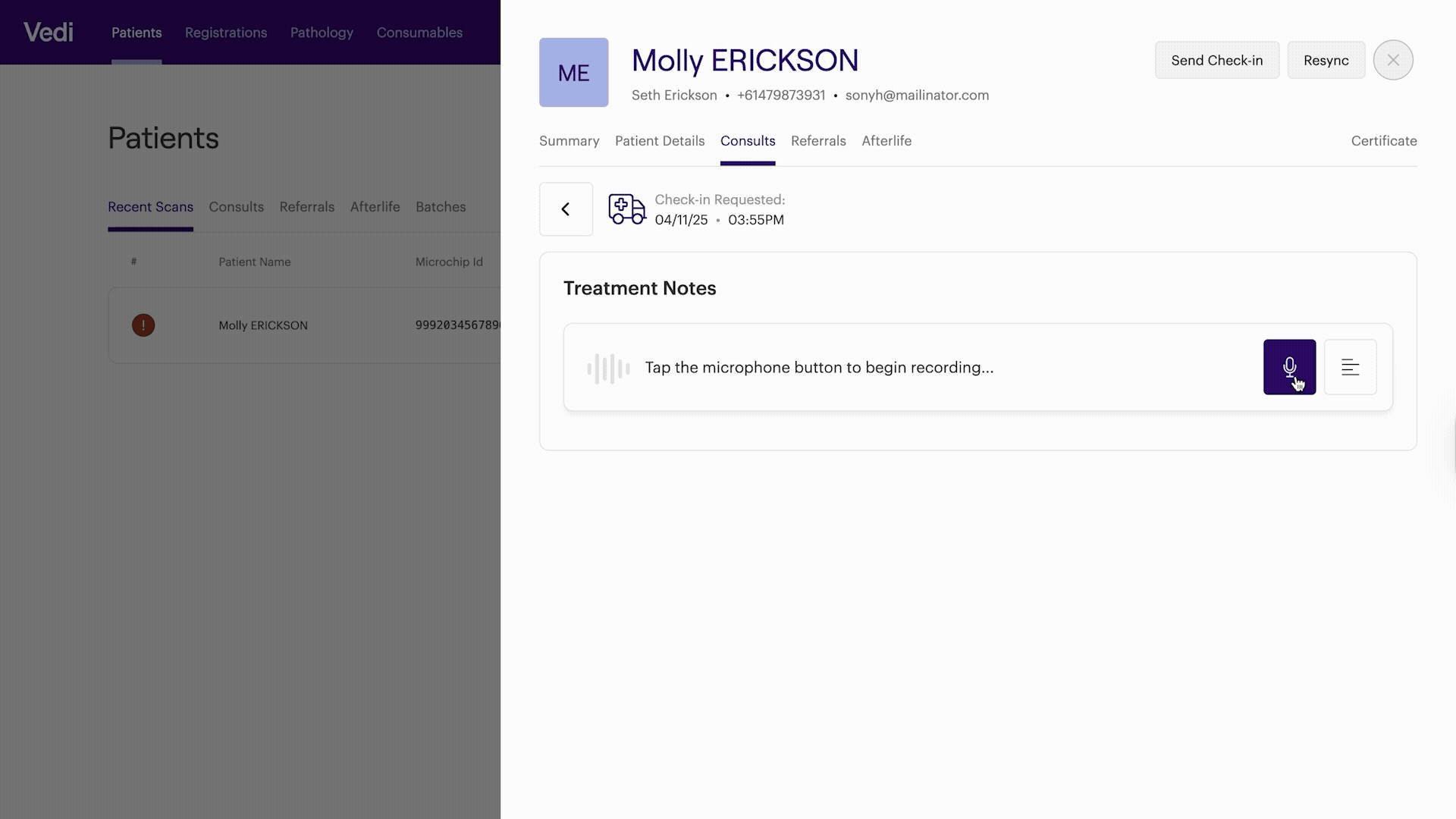 Port Kennedy Vet Hospital uses Vedi for its pathology and microchip registration workflows. Once a pet patient is scanned in with a Vedi scanner, all pathology and microchip registration procedures are locked to its microchip. This has saved hours of admin work, and improved patient safety by reducing errors.
