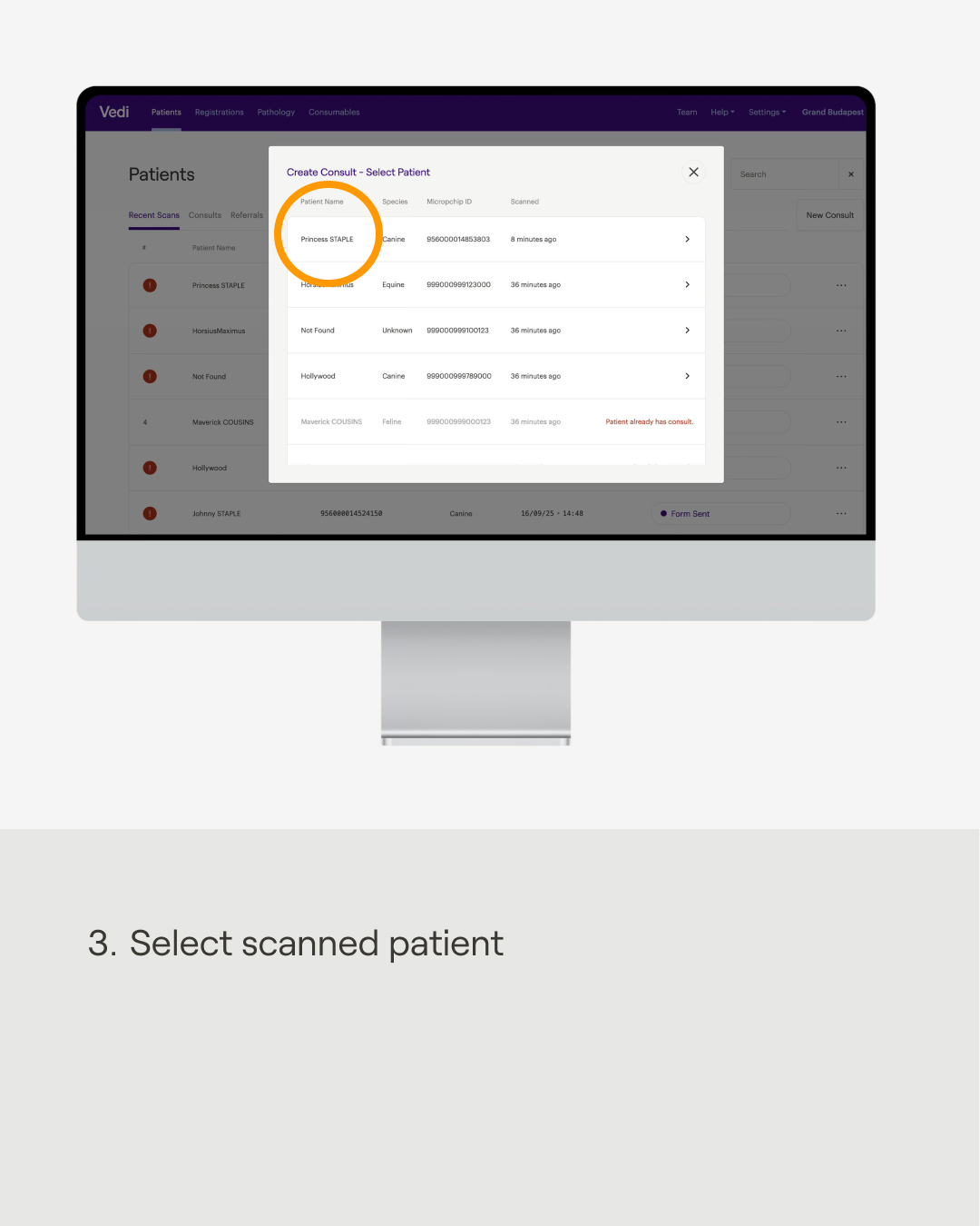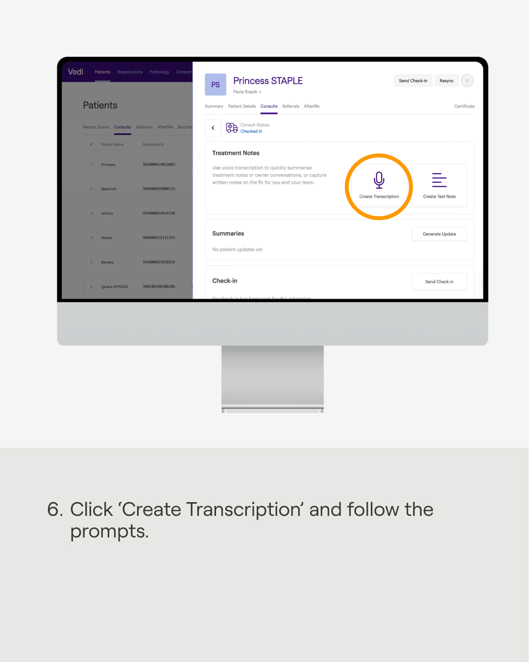 - In the consults tab, select the patient's profile then click 'Create Transcription' and follow the prompts