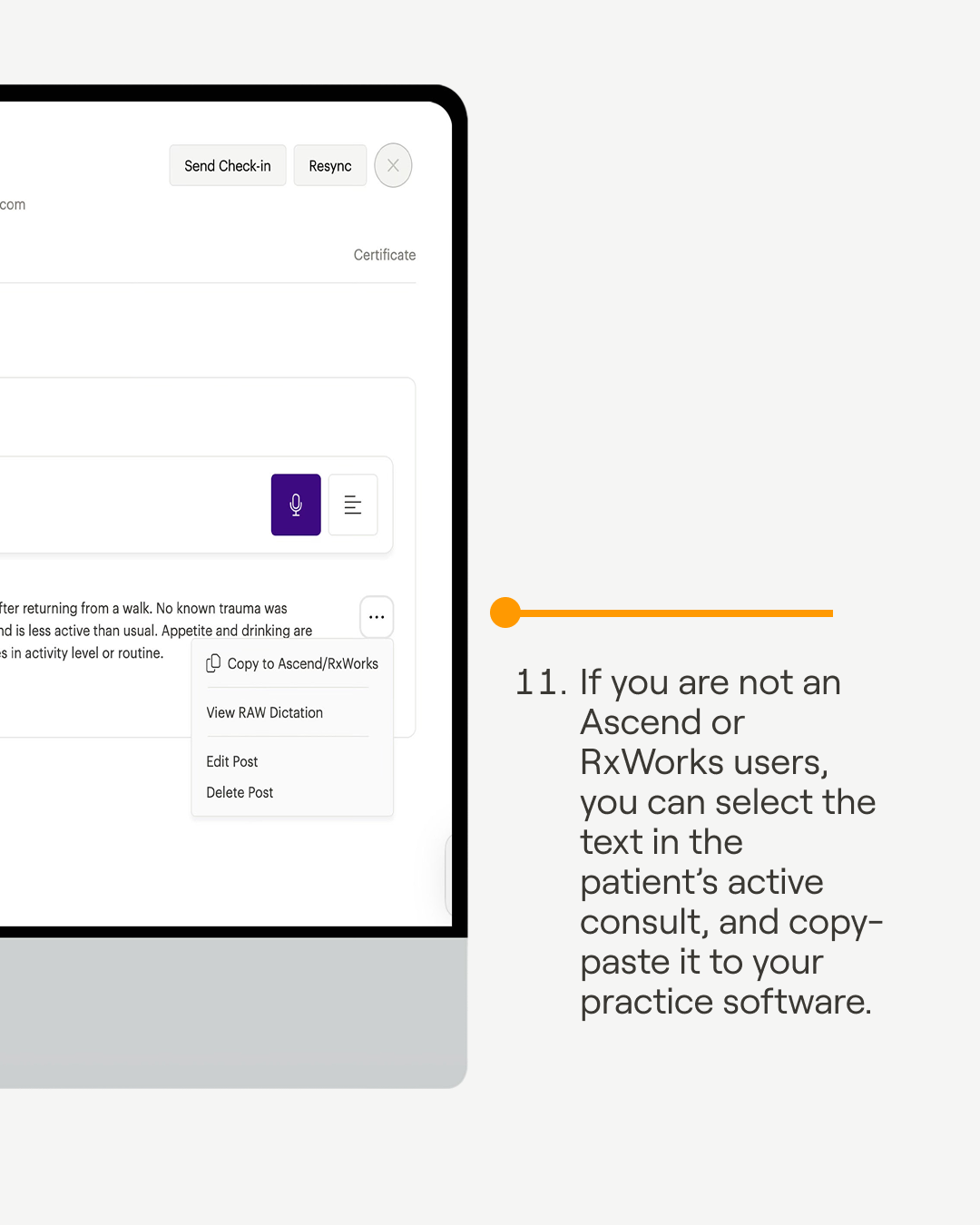 - To copy notes to your practice software, select the transcription in the patient's active consult, and simply copy-paste the text.