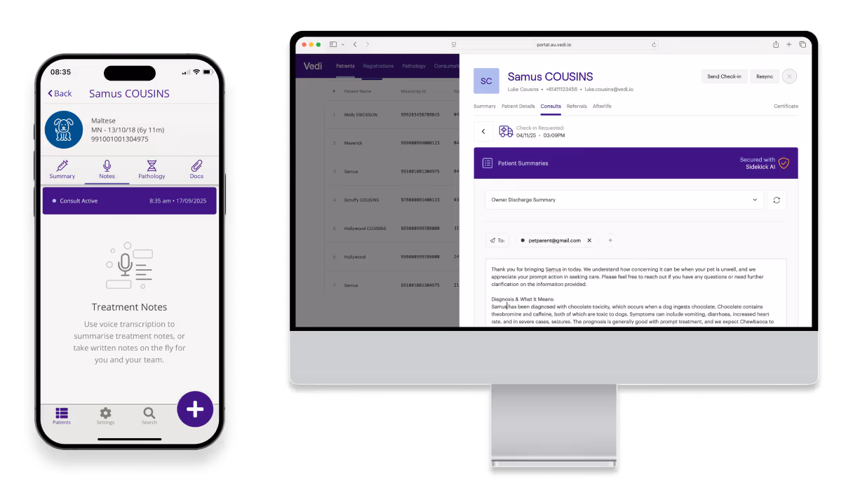 Sidekick is Vedi’s AI-powered scribe that transcribes, structures and summarises veterinary consults.